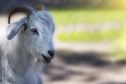 Fototapeta premium White goat closeup, blurred background.