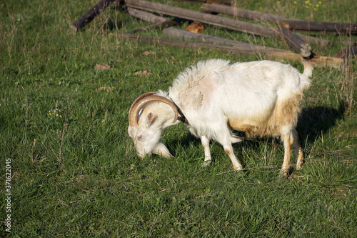 Obraz premium White goat grazes in the meadow. Green grass all around.