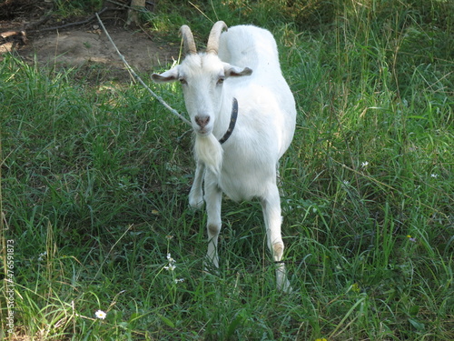 © Lumatis, Fototapeta premium white goat grazes in the summer in the village on a leash