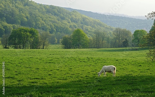 Naklejka premium White Goat Grazing In A Green Spring Pasture