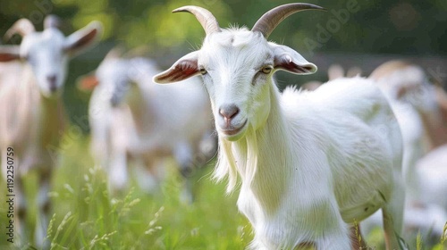 Obraz premium White goat grazing pasture, herd background, farm animal