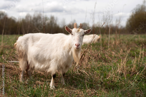 Fototapeta premium White goat in a field on a paddock.