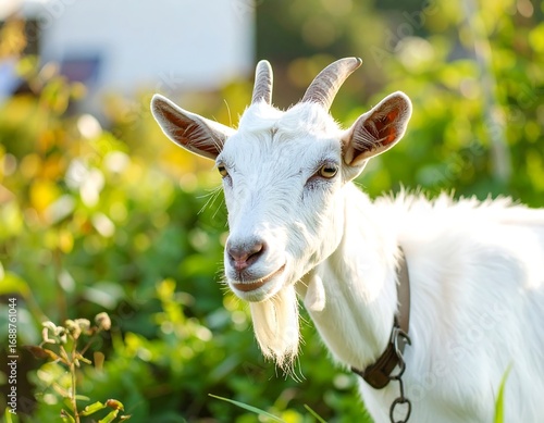 Obraz premium White goat in a garden setting