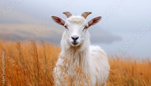 © Tombo, Obraz premium White goat in autumnal field, misty lake background