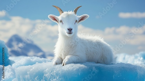 © Dian, Fototapeta premium White goat kid on glacier, mountains background, wildlife photography, nature