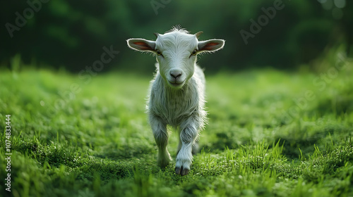 © farikhin, Obraz premium White Goat Kid Standing in Green Grass Realistic Image