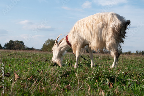 © Vasyl, Obraz premium White goat on pasture looking at the camera with trees and open rural scenery behind.