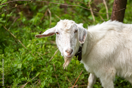 © Krasi Kanchev, Obraz premium White goat on the field in a village close up.
