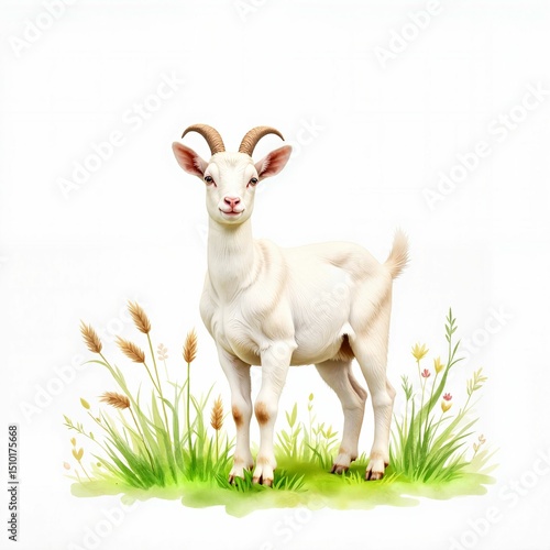 © Olga, Obraz premium White goat standing confidently in lush grass with flowers and copy space on a white background