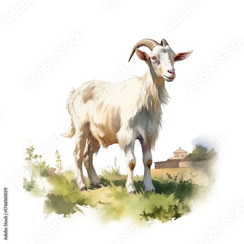 © Studicon, Obraz premium White goat standing in a field near a stone building