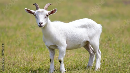 Fototapeta premium White goat standing in a green field on a sunny day showcasing a peaceful...