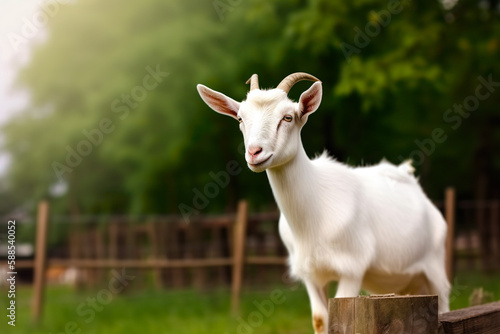 Fototapeta premium White goat standing on a fence on a farm in the summer.