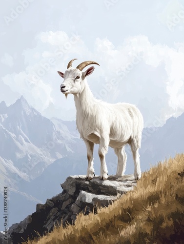 © Dzikrul Husnani, Obraz premium White Goat Standing on Rocks with Mountain Vista and Cloudy Sky