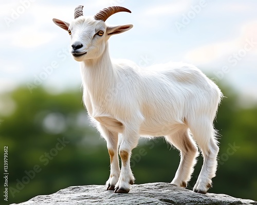 © Apriani, Obraz premium White goat stands on a rock against blurred trees