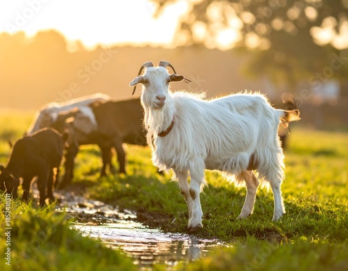 © Errs, Obraz premium White goat stands proudly near others in warm sunlight