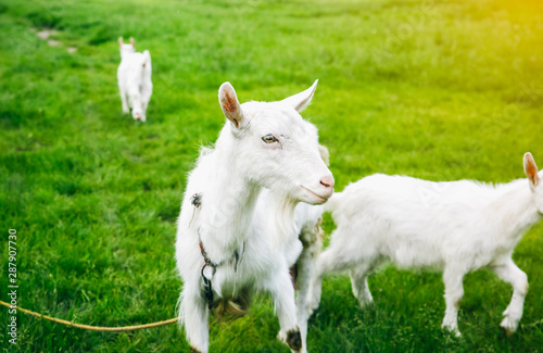 Fototapeta premium White goat with its babies on the grass. Domestic animals in the nature.