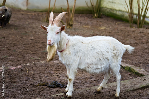 © Mario, Obraz premium White Goat with Long Horns in Enclosure