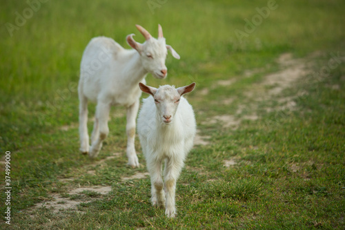 © Arina B, Obraz premium White goats graze on a country road on a summer day.