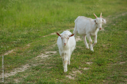 Obraz premium White goats graze on a country road on a summer day.