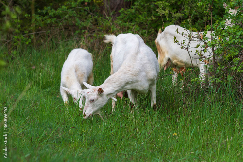 © Roman Bjuty, Fototapeta premium White goats in a meadow bite trees and graze on grass.