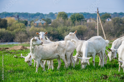 © white78, Obraz premium White goats in a meadow of a goat farm