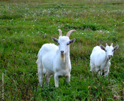© alex2016, Fototapeta premium white goats on a green meadow, a pet, free grazing, organic farming
