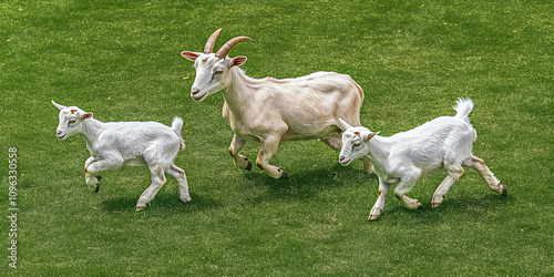 © Neungruedee, Fototapeta premium White Goats Running on Grass in a Sunny Field