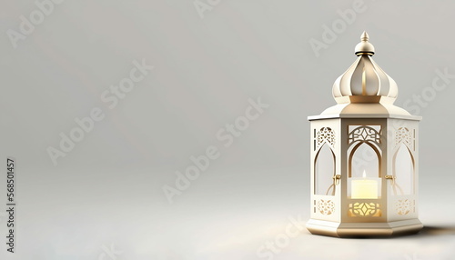 © Designkuy, Fototapeta premium White gold Islamic light lantern flat background, with copy space area. Generated with AI. Suitable to use for Ramadan or Eid al-Adha and Eid al-Fitr event