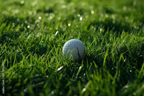 © nsit0108, Naklejka premium White golf ball sits on vibrant green grass, bathed in sunlight, creating a serene golfing scene