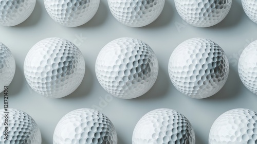 © Almahyra, Fototapeta premium White golf balls arranged neatly on a grey surface, studio shot, clean background, website design