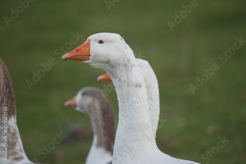 © Iryna, Fototapeta premium White goose looking right with two others in background