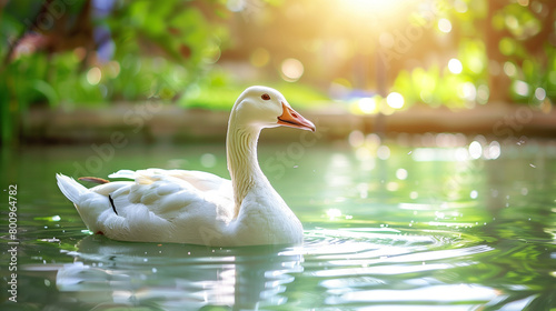 © Jiranun, Obraz premium White goose swimming in the pond at a garden.