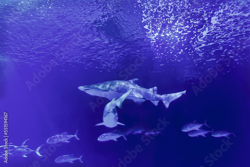 Naklejka premium White grey shark jaws close up portrait while looking at you while diving in...