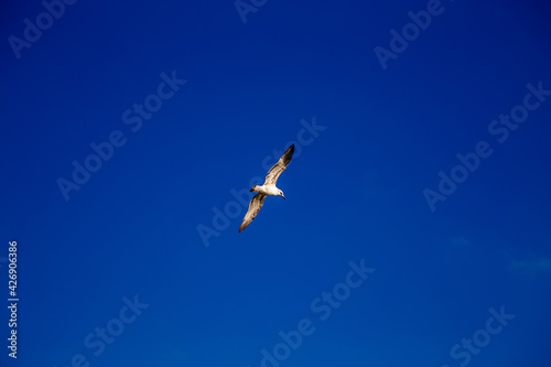 Fototapeta premium white gull spread its wings in flight under the blue sky