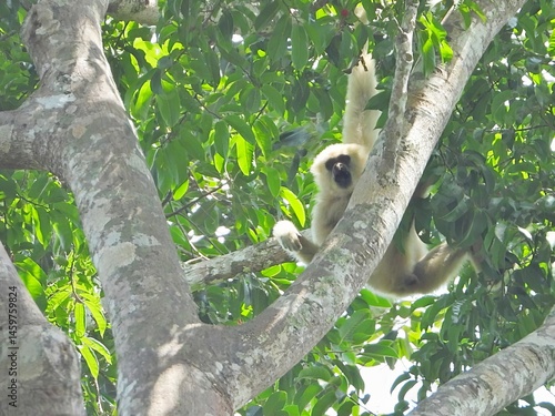 © Jeab, Obraz premium White handed Gibbon Hanging in Lush Tropical Rainforest Tree Canopy