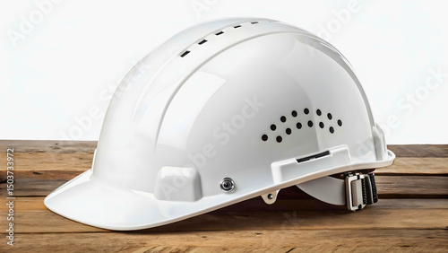 Fototapeta premium White hard hat isolated on white background on a wooden surface in studio shot