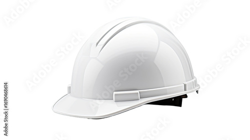 Fototapeta premium White hard hat with protective safety helmet design symbolizing construction gear, industrial work equipment, and worker protection, isolated on white background