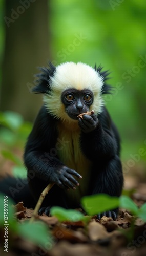 Fototapeta premium White headed capuchin foraging in forest undergrowth, capuchin, forest floor