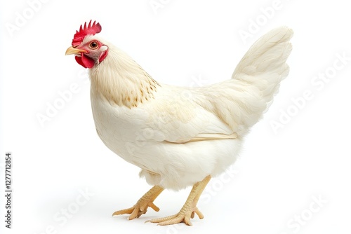 © LittleDuck, Fototapeta premium White Hen on White Background - A pristine white hen stands against a stark white backdrop, showcasing its feathers and posture