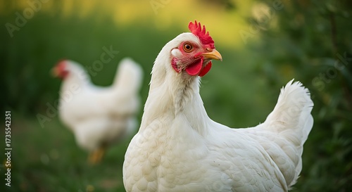 © Kapten, Fototapeta premium White hen portrait against a blurred green background on a sunny day