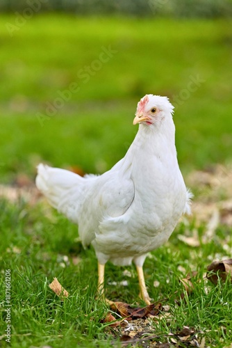 Fototapeta premium "White Hen Walking on Grass in a Natural Rural Setting"