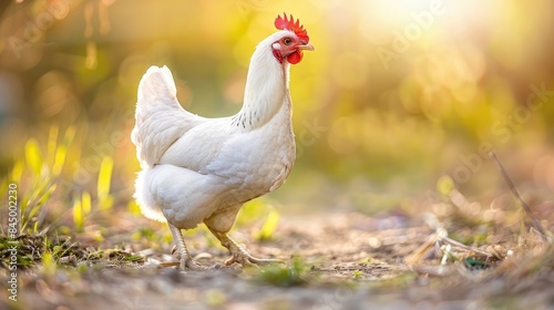 Fototapeta premium White hen walking on ground in farm house side view photo focus on blurred...