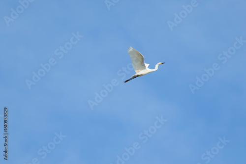 © NOS, Fototapeta premium White heron flying in the blue sky