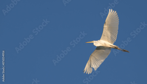 Fototapeta premium White heron, or great egret, flying overhead against a blue sky.
