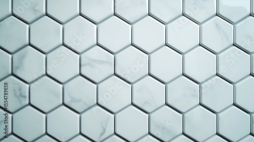 © Tanakrit, Naklejka premium White hexagonal marble tiles with subtle gray veins form a sleek, modern geometric pattern on a wall or floor surface.