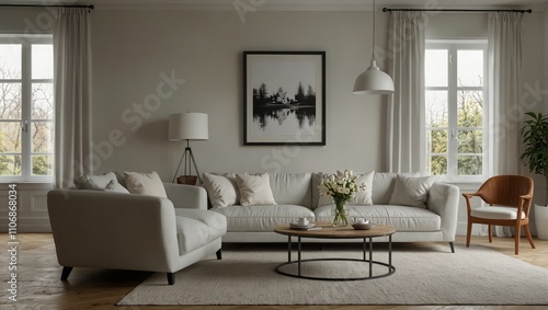 Fototapeta premium White home living room interior with table and chairs, window. Mockup frame