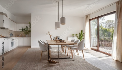 Fototapeta premium White home living room interior with table and seats, shelf and panoramic window