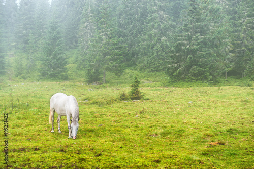 © Pavlo Vakhrushev, Fototapeta premium White horse grazing on a green field with fog