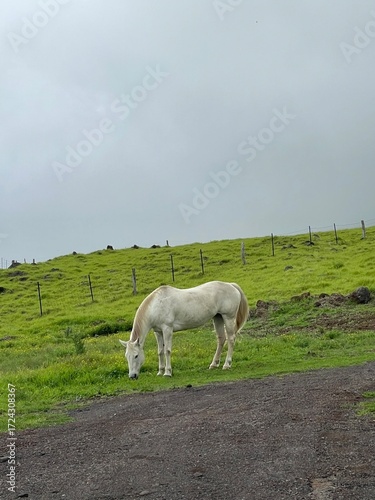 © Trisa, Fototapeta premium White Horse Grazing on Green Pasture