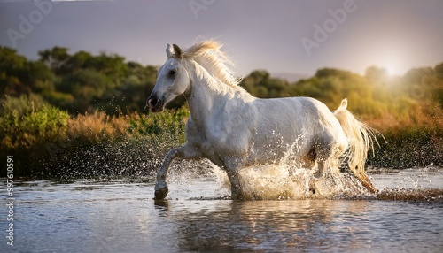 © Jay Nandu, Fototapeta premium White horse in motion galloping through a shallow river, with water splashing around its leg